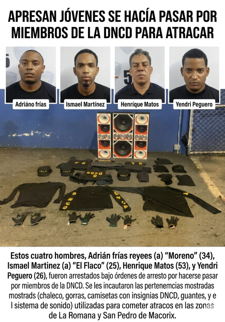 San Pedro de Macorís.– La Policía Nacional informó que desarticuló una banda criminal que se hacía pasar por agentes de la Dirección Nacional de Control de Drogas (DNCD) para cometer atracos, logrando el arresto de cuatro de sus presuntos integrantes, mientras que un quinto implicado permanece prófugo.
